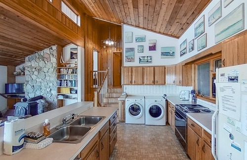 The second level is the main living area. This room offers the best view of the lake from the inside. Large windows and new doors span the front of the cottage. The open floor plan has a spacious kitchen overlooking the living and dining areas. The living area offers two sofas and a rocking chair. Sit back and relax while watching tv or enjoying a fire in the woodstove.