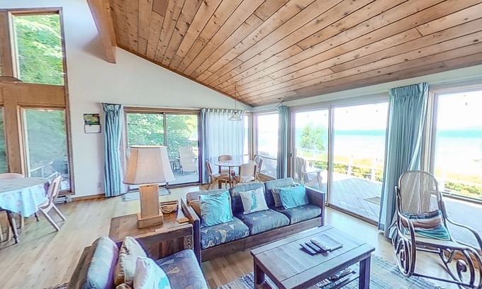 The Schubery sits on the south shore of Crystal Lake, shaded by the bluff behind. Across the road from the home is 200' of private waterfront with a small sandy beach, firepit, and sandbox area. Enjoy some of the best views of the Lake from inside the home or outside on the spacious deck.