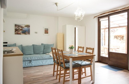 Food & DrinkTea/Coffee maker, Chocolate/CookiesBathroomShower, Toilet, Hairdryer, Toilet paper, Private bathroom, TowelsMedia & TechnologyCable channels, Flat-screen TV, TVGeneralHardwood or parquet floors, Smoke Alarm, Heating, Ironing facilities, Air conditioning, Mosquito net, Private entrance, Soundproof, Fire extinguisher, Trash cansKitchenWine glasses, Kitchenette, Kitchenware, Electric kettle, Coffee machine, High chair, Stovetop, Dining table, Toaster, Kitchen, Microwave, RefrigeratorOutdoorsBalcony, Outdoor furniture, Patio, Outdoor dining area, TerraceLiving AreaDining area, Sofa, Sitting areaViewGarden view, ViewBedroomWardrobe or closet, Childrens' cribs, LinensAccessibilityEntire unit located on ground floorBuilding CharacteristicsPrivate apartment in buildingRoom AmenitiesSofa bed, Fold-up bed, Socket near the bed, Drying rack for clothing, Non-feather pillow |