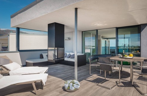 From the 44 m², semi-covered and sheltered roof terrace, the view to the south to the km-long sandy beach and the harbor is incredibly beautiful. Due to the height and orientation of the roof terrace you are absolutely private. The covered part provides shade in midsummer and still offers the opportunity to be outside in inclement weather. And if it gets a little cooler, the open fireplace and the radiant heater above the lounge corner can help. In sunshine, of course, unrestricted sunbathing is possible.