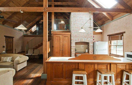 • Vaulted ceilings and unfinished timber floors which add to the rough-hewn feel