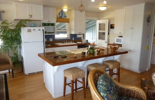 The open floor plan incorporates the kitchen, great room, and dining area....all with a great ocean view. Walls of windows capture the trade winds, keeping the cottage comfortable.