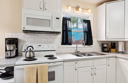 This cozy and tidy home in the Hood River Heights neighborhood will welcome you feeling relaxed. It is dog-friendly, and in a convenient location for up to four guests. Located a short walk to Pine Street Bakery, Slope Swell Cidery, and The Farm Stand, you'll have easy access to some of Hood River's best food and drink. And not far from the Indian Creek Trail. The bright atmosphere of the home will make you feel welcome right away. There is a piano and a flat screen TV for your entertainment. The fully equipped kitchen provides you with everything you need to eat in. There are two bedrooms, and one bathroom, as well as a small half-bath. And you can take care of the laundry with a private washer/dryer. Please park in the driveway, overflow may park on the street. The back yard is fenced if you decide to bring Fido, but please consider the neighbors with regard to noise, and always clean up after going potty. Pet fee applies. This home has central AC License #541, Sorry no AMEX.