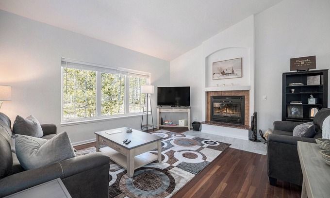 • Cozy living area with a fireplace & large windows overlooking the mountains
