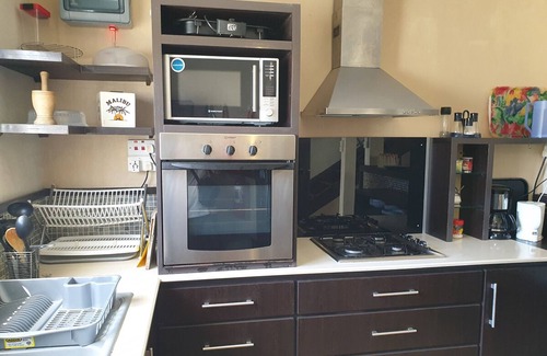 This 3-bedroom, 2.5-bathroom rental features a BBQ grill and air conditioning. Bathroom amenities include a hair dryer, towels, and toilet paper. The kitchen is equipped with an oven, a stovetop, and a refrigerator, as well as a coffee maker, an electric kettle, and a microwave. And you can even pack a bit lighter because there's a washer and dryer.