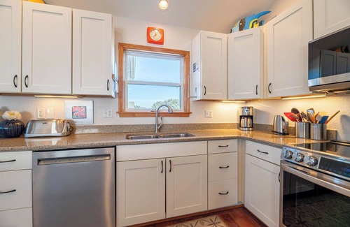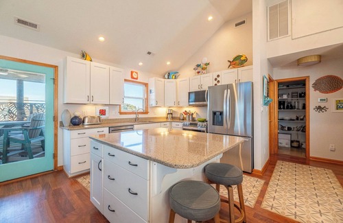 The ground floor has a newly renovated game room with modern lighting, flooring, and a beautiful American-made vintage pool table. There's even an outdoor ping pong table in the carport. The large, well-equipped kitchen offers new stainless-steel appliances, quality stainless cookware, flatware, dinnerware, and serving pieces to satisfy even the most serious cooks.