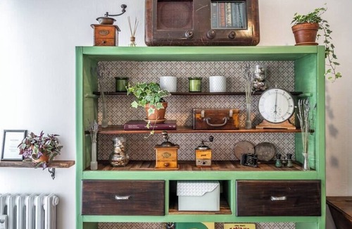 In a wonderful vintage bookcase we have set up an entertainment corner for children, with books, stationery, games and puppets.