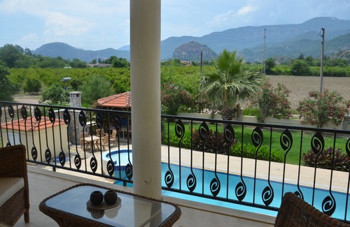 Luxury villa,brand new for 2007,set within its own grounds.Constucted and furnished to a very high standart consisting of 7 double bedrooms all with ensuite.Out side there is disabled access.Games room with TV/DVD&playstation and a bed settee to sleep a further two people if required.Large open plan kitchen and living area with 42" plazma satilite TV.Large patio seating area with large outside pool,with water fountain feature.Outside BBQ and shower.Magnificent view of the mountains.situated in a rural part of Dalyan on the beach road,but within 15 minutes walking or 3 minutes driving distance to the centre of Dalyan.