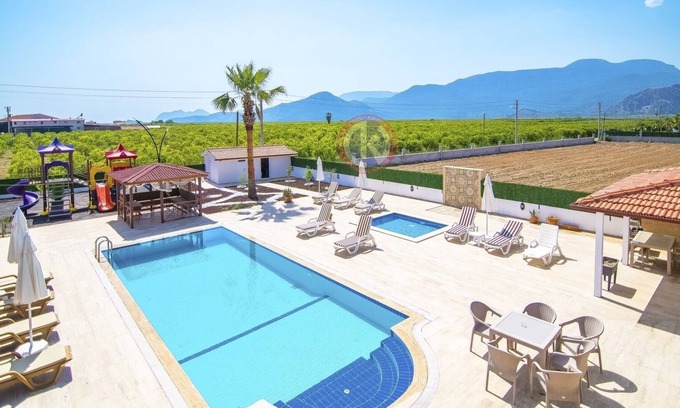 The villa has a capacity of 12 people, each with an en-suite bathroom, 5 bedrooms and 5.5 bathrooms-wc. It is ideal for families with children and large groups with its large garden, children's pool and large playground. The villa, located on the Iztuzu road, is sheltered because it is on a 2,5-decare plot, there is no building around it, and the pool and garden are not visible from the outside. You can watch the sunset on the Iztuzu coast from the terrace on the upper floor