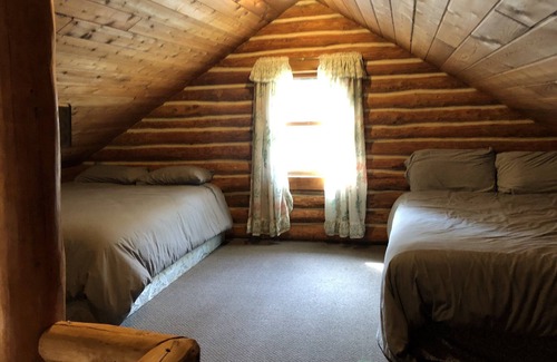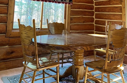 Log cabin on 10 acres. There’s 1 bedroom with a king bed. There’s an additional 2 queen beds located in the loft area.. Ride your snowmobile or atv right from this property. Cabin has Starlink high speed internet with a Roku for logging into your personal Netflix etc, gas grille on deck, Keurig coffee maker, split wood for the wood stove, furnace, air conditioning, three season porch , deck, and fire pit in backyard. Property is located close to the st. Croix river and the Namekagon river which makes for great Kayaking or canoeing.