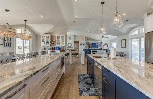 Top-Level: Great Room with Ocean Views, 77" 4K Smart TV, Hall Half Bathroom, Poker Table (Seats 6), Elevator, Kitchen with 3 Sinks, 2 Refrigerators, 2 Dishwashers, Wolf 60" Gas Stove with 6 Burners, Griddle, and 2 Ovens, Microwave Drawer, Pot Filler, Pantry, 2-4 Slice Toaster, 2 Coffee Makers, Mini Fridge, Dining Table #1 seats 12, Dining Table #2 seats 10, Counter seats 3, Deck Access, Screened Porch with Dining Table seats 6 and Sectional, King Master with Smart TV, Private Deck Access, Ocean Views, 2 Sink Vanity, Large Soaker Tub, Oversized Tile Shower including separate Handheld Shower Sprayer