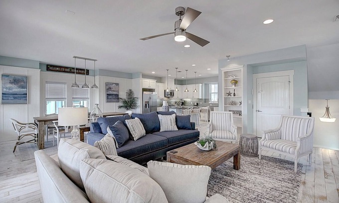 This fabulous home boasts four bedrooms, whitewashed pine floors, wainscoting, and casual coastal decor, and an elevator.