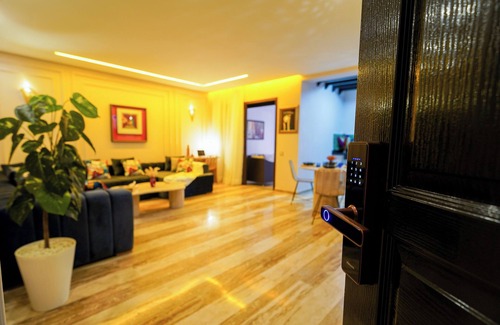 Welcome to DarSublime in Marrakech, where elegant design harmoniously blends Moroccan tradition with modern comfort. Your Marrakech adventure begins at this charming 1-bedroom apartment, featuring a luxurious king bed and a cozy living room with two futons for extra guests. Enjoy high-speed fiber-optic internet, an IPTV-equipped television, a functional desk for remote work, and centralized air conditioning. The fully equipped kitchen has everything you need, and for ultimate relaxation, our heated jacuzzi awaits you. Perfectly situated in the hyper center of Guéliz, just 5 minutes from the Majorelle Gardens and Jemaa el-Fna Square, with the airport only 12 minutes away by car. Immerse yourself in the magic of Marrakech at our welcoming apartment.