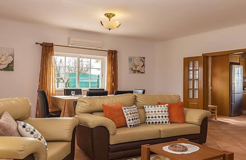 Villa "Casa das Amendoeiras", 2 storeys, detached. 9.3 km from the sea. Private: property 2'000 m2 (fenced), beautiful garden to relax, swimming pool angular, heated, fenced (depth 80 - 150 cm, seasonal availability: 01.Jan. - 31.Dec extra) with salt-electrolysis pool-cleaning system. Outdoor shower, barbecue. In the house: WiFi, air conditioning, burglar alarm system, washing machine. Airport transfer. Parking (for 5 cars). Shop 6.2 km, grocery 5.6 km, supermarket 6.2 km, shopping centre 10.7 km, restaurant 5.6 km, bar 9.3 km, bakery 6.2 km, café 5.6 km, internet café 9.3 km, pub garden 9.3 km, bus stop 2.5 km, sandy beach "Praia de Armação de Pêra" 9.3 km. Golf course (9 hole) 4.6 km. Nearby attractions: Zoomarine 9.3 km, Slide e Splash 19.7 km, Algarve Shopping Guia 10.7 km.