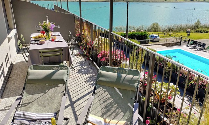 Your holiday home is surrounded by nature: the lake, a bird-watching and sports area at the same time: rowing, canoeing, stand-up paddling. Meadows on the lake side, rocky slopes on the mountain side, and occasional residential houses in the neighbourhood. On the lake side is the underwater-lit pool with deckchairs and the Jacuzzi. On the lakeside is the deckchair area and the dining table area with barbecue. Boat mooring on request. On the lake side is the panoramic balcony with canopy, dining table and two sun loungers.