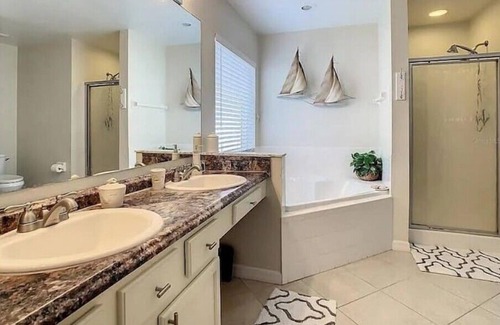 Welcome to this beautiful home in gated community located in Davenport. The house has ample living space, 4 bedrooms (7 beds) & game room. Kitchen is stocked with appliances for your use throughout your stay and a washer and dryer available for use. A private swimming pool. House is located 20 minutes away from Walt Disney and close to Theme Parks. Enjoy golfing at Champions Gate Country Club or Highland Reserve. Nearby are several restaurants and shopping centers for all your needs.