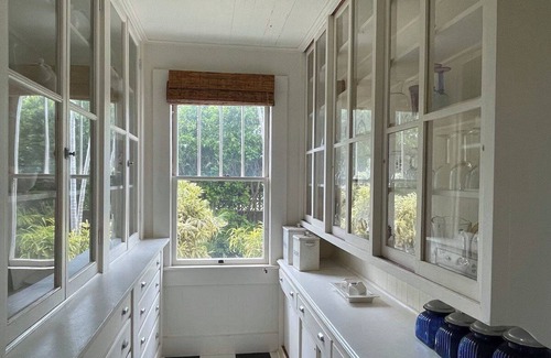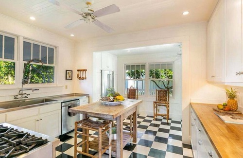 This Kekaha estate was featured in the book the Hawaiian House Now and was one of only two houses from Kauai in the book published in 2007. Hawaii still lives in Kekaha said Gail Miller of the sleepy West Kauai town she lived in since 1998, when this publicized and well known designer purchased this Sugar Mill Manager home. Originally built in 1933, it was purchased by Miller after she first saw this beach side house. It was the original features, many of which were preserved during the extensive renovation, that attracted her to this house. Rich Douglas fir floors, gracious archways, ceilings fabricated from sugar cane, and large rooms that opened onto the outdoors provided the ingredients to create and preserve a piece of rich Hawaiian heritage. Neutral colors have been used to highlight the beauty of the outdoor ocean setting she said in describing the interior finishes. Surfers and tourists line the shore to watch the sun drop into the western horizon at an hour that used to bustle with workers returning from the fields to their homes here in Kekaha.