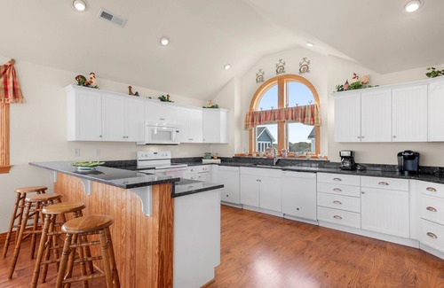 The main living area on the top level features vaulted ceilings, oversized picture windows for plenty of natural light, and kid-friendly wood flooring throughout. Comfortably furnished, there's plenty of seating for watching movies or curling up with a book by the gas fireplace. The open-concept layout allows guests to work in the kitchen while still being part of the action, and everyone can enjoy meals together at the large dining table for 12, plus bar seating for 4 more. You can also serve dinner or drinks outside on the deck overlooking the pool. Use the elevator from the ground level to make unpacking luggage and bringing in groceries a breeze. Host poker night in the Ships Watch, which offers a slight view of the sound for spectacular sunsets. Or shoot pool downstairs in the rec room, featuring a wet bar and additional full-size refrigerator that can be easily accessed from the pool area. Sure to be the most popular area of the home, this outdoor oasis features a large private pool and hot tub, plus a grilling area and enclosed outside shower. The pool can be heated during certain times of the year, ideal for off-season getaways. After a long day of fun in the sun, retreat to one of the six master suites for some privacy and quiet time.