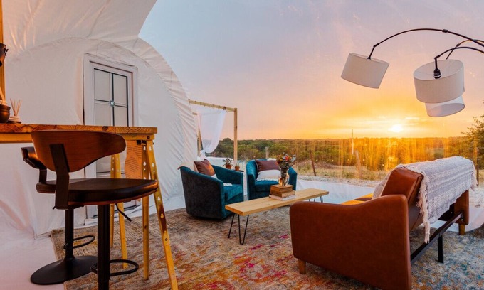 The living room is a wonderful place to spend time together and make memories. The dome living room looks out on, in our opinion, one of the most breathtaking sights in DFW with some of the best sunsets. In addition to it being a wonderful gathering spot, the sofa folds down into a twin bed for additional sleeping.