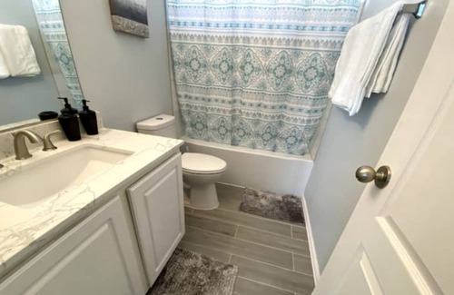 This newly updated 3 bedroom, 2 bath comes with a 55' TV, well-furnished kitchen, central A/C, WiFi, and multiple car parking spaces (excluding the garage). For your convenience, there is a laundry equipped with a washer and dryer to the left and as you make your way to the hallway on the right, you will see the master bedroom furnished with a king-sized bed, recliner, chest drawer, and side table. The master bathroom comes with a large shower panel and a European-style commode. Past that, is the walk-in closet. Next up, is the well-furnished living area with couches and a sleeper sofa. The dining area is furnished for the comfort of the whole family. There is also a laptop-friendly study area. From the living area, you can navigate your way to the other 2 bedrooms. The one in the middle is furnished with a queen-sized bed and the other one is furnished with a full-sized bed and a twin-sized bed. All the bedrooms have ceiling fans with light. Both bedrooms have easy access to the last bath.