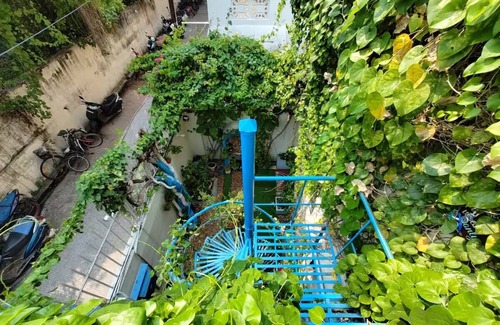 Guests are kindly asked to enter the room using the front gate. Follow the blue spiral staircase adorned with flowering creepers, which will lead you to the room.