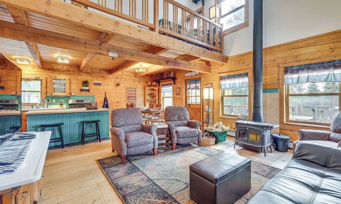 Make the most of your next mountain adventure at this rustic vacation rental in Black Hawk, Colorado! This 2-bed, 2-bath cabin boasts a full kitchen, a cozy living area with a wood-burning stove, and easy access to all-season escapades like scenic hiking trails, tranquil fishing spots, and ski slopes. When you’re ready to venture out, explore Golden Gate Canyon State Park or try your luck at nearby casinos!