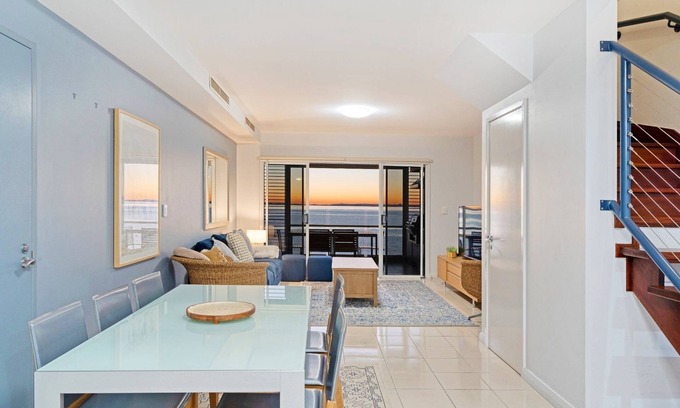 Deep Blue apartment 13 is a two storey apartment with amazing views over Moreton Bay. Spacious 2 bedroom apartment, with bunk area and 2.5 bathrooms, accommodating up to 6 guests. Offering fully ducted air conditioning, this apartment has a full kitchen with stainless steel appliances, dining for 6 guests and large loungeroom. The outdoor entertaining balcony features an outdoor BBQ area with sink, and drinks fridge with dining for 6 guests. Upstairs bedrooms feature a master bedroom with full ensuite, 2 x singles in bedroom two and single bunk beds in the bunk area.