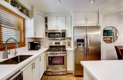 Kitchen: Fully equipped kitchen with stunning stone countertops, and modern stainless steel appliances - including a gas range, ice maker, and island seating for two.