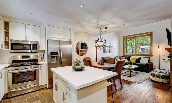 Living Room: This room is newly decorated and boasts vaulted ceilings and abundant natural light, a plush sectional with a queen, Posturepedic sofa bed, gas fireplace, and a 55” Smart TV, Step out onto the private deck w and have a coffee or a nice wine where you'll find outdoor seating and table, as well as beautiful surrounding views of the mountains and Park City trails.