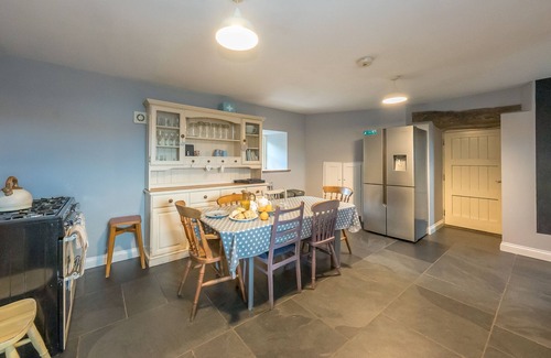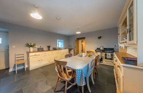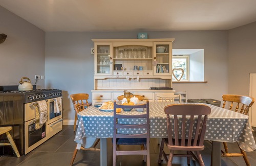 The farmhouse kitchen, complete with a charming range cooker and a large farmhouse table, is a dream for leisurely meal preparation. From hearty breakfasts to long, home-cooked dinners, this space is as inviting as it is functional. Large windows offer inspiring views of the Welsh hills, making even the washing up a chance to soak in the scenery.