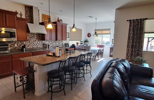 This spacious open concept 3 bedroom home is perfect for groups to sit back and enjoy Arizona. The backyard garden attracts various birds and critters with the sounds of the running fountain. There are 2 separate living room areas which is perfect for multiple families or couples wanting to share a place, but have their own space. Each living room has a large flat screen TV with internet TV and plenty of comfortable leather seating.