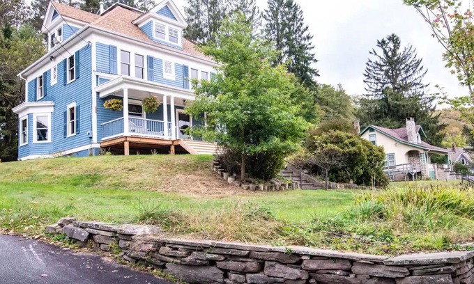 Perched on a hill above the town of Jeffersonville, Dancing Doe Estate is a perfect marriage of country charm with the comforts of small town living for those seeking a country getaway without being in an isolated location. The stately blue mansion, features light-filled spaces, wrap around porch and generous room sizes to comfortably accommodate up to 8 guests. ** Please note that this is not a party house. No loud noises and outdoor music after 7 pm, it is in a residential neighborhood.
