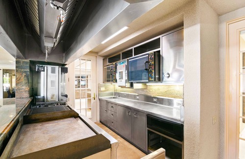 The gourmet kitchen is a chef’s dream, equipped with granite countertops, four kitchen islands, four refrigerators, two cooktops, four ovens, and two dishwashers - perfect for preparing meals for large gatherings or a private chef experience. The informal dining area offers seating for 8, complemented by a spacious sitting area with five HDTVs and a sectional sofa for casual entertainment.