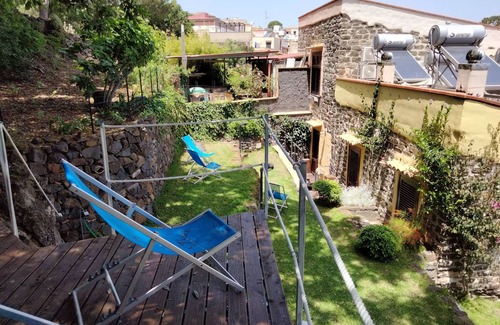 new equipped and air-conditioned apartment consisting of bedroom with TV and large living room with kitchenette equipped with oven, burners, separate fridge and freezer, coffee maker, TV, external and internal retractable dining table, with garden with dining areas and relaxation with deckchairs on the lawn and shaded platform for reading and resting with a panoramic view, barbecue in the garden for shared use. The apartment is located in a very quiet ancient farmhouse in the town a few steps from the square with all services.