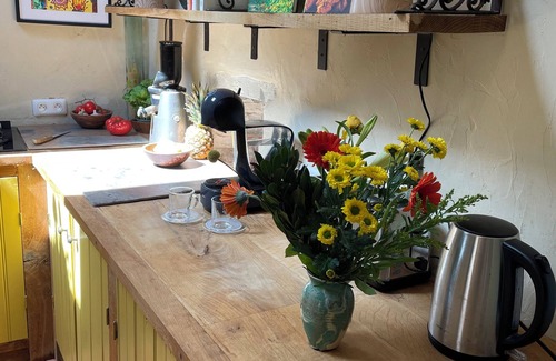 From the daily living space you will step up through door into our bright, colourful, cheerful kitchen with handmade wooden units annd oak counter tops finished with a warm terracotta floor tiling. This is suitably equipped for your holiday stay comprising of basic necessities such as fridge, microwave oven, gas hob, kettle, toaster etc please see other equipment /accessories in the amenity section. There is no freezer, but you are welcome to use ours at anytime.. don’t hesitate to ask! There is no washing machine in the kitchen, but again you are most welcome to use ours located in the barn along with a tumble dryer ( there will be a clothes horse/ dry rack supplied also).