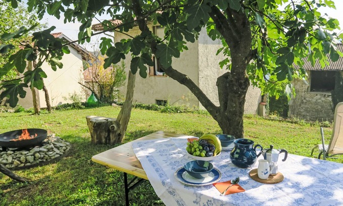 Pulfero: Single-family house "delle Maschere", 2 storeys, renovated in 2023. In the district of Rodda/Clavora 10 km from the centre of San Pietro al Natisone, 16 km from the centre of Cividale, 32 km from the centre of Udine, in a quiet position, 70 km from the sea, 5 km from the river. Private: property, terraced garden (not fenced) with trees, meadow. Garden furniture, fireplace. In the house: sauna. Motor access (4.5 km mountain road). Parking (for 3 cars) at the house. Grocery 10 km, supermarket 16 km, bar 5 km, bus stop 4.5 km, sandy beach "Grado" 70 km, shingle beach "Fiume Natisone" 5 km. Nearby attractions: Kobarid-Soca Valley 21 km. There are 3 e-bikes for free available for our guests. The owner is a passionate woodcarver and has decorated the house with his handmade masks.