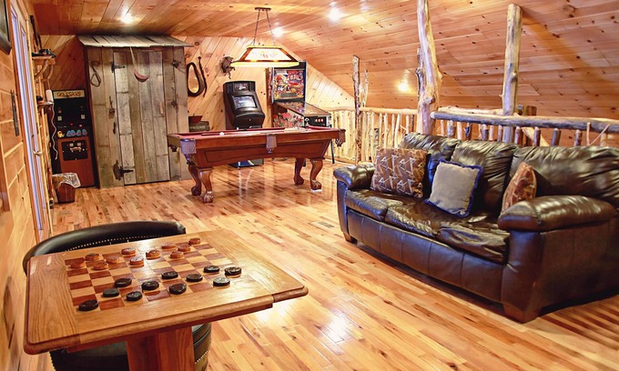 Almost Heaven Amenities: Sleeps 8, 8-person hot tub, sauna, pool table, propane fireplace, massage chair, fire pit, gas grill, high-speed internet, LCD TV, washer/dryer, arcade, pinball, dartboard, checker table, free Wi-Fi, bedrooms with TVs, 7 miles to Bear Wallow Trail, extra parking, telephone, cable TV, central heat/air, microwave, stainless steel appliances, DVD, dishwasher, large deck (16x32), covered porch, non-smoking, full kitchen, coffee maker, blender, toaster, mini fridge on the deck. Bedrooms: 2 kings, sleeper sofa (2 queens), airbed: 2 queens; silverware, pots, pans; towels, washcloths, sheets, pillows included. Starter supplies: soap, shampoo, conditioner, paper towels, toilet tissue, laundry detergent, and dish detergent.