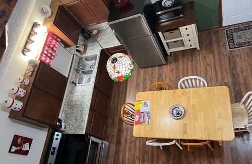 The large full kitchen includes a microwave, coffee maker, dishes, pots, and pans.