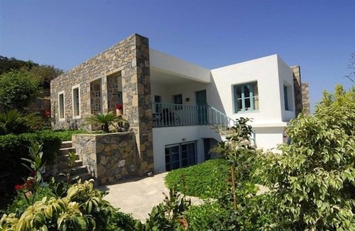 A small family hotel complex of three villas, standing on a hillside with a panoramic view of the village and island of Mohlos.