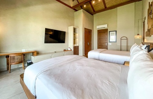 Experience modern comfort and spacious elegance in our Garden View Deluxe Double Room, designed for families, friends, or travelers seeking extra space without compromising on style. Featuring two plush queen-sized beds, this elegantly appointed retreat boasts contemporary decor, expansive interiors, and floor-to-ceiling windows that frame the lush tropical gardens of Las Verandas Hotel & Villas.