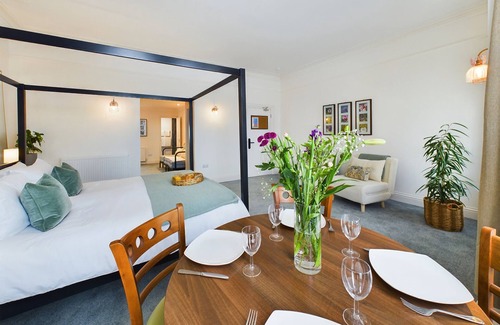 Spacious Ground Floor Family Retreat. Experience comfort and style in this beautifully appointed ground-floor apartment at The Briarcroft | Wayth Hotels. Perfect for families or groups, this open-plan space features a stunning Super King four-poster bed, two single sofa beds, and a double sofa bed – offering flexible sleeping arrangements for up to six guests. Enjoy the convenience of a fully equipped kitchen, ideal for preparing meals together, and a private en-suite bathroom stocked with eco-friendly toiletries for a refreshing touch. With generous space, elegant design, and all the modern amenities you need, Apartment 1 is your perfect home away from home.