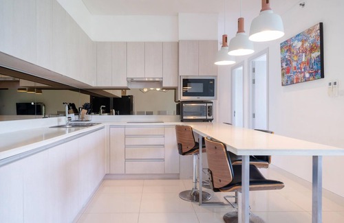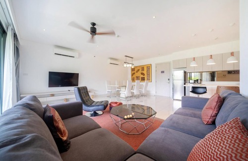 Step into a sleek, contemporary living space ideally prepared for your vacation. The apartment is air-conditioned and boasts three bedrooms with smart TVs, two bathrooms, and an open-plan layout featuring living and dining areas, and a fully equipped kitchen.