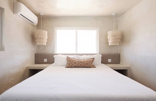 Immerse yourself in coastal charm with our newly renovated Baja-inspired retreat. This air-conditioned oasis boasts a spacious living area, fully equipped kitchen, and a serene ocean view from every window. Just a quick stroll to the beach, it's perfect for up to 3 guests seeking relaxation and comfort. Experience the essence of seaside living in style.