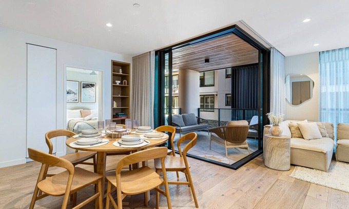 As you step inside, you'll be greeted by modern furnishings and a spacious layout that invites relaxation. From contemporary decor, the apartment exudes a fresh and airy ambiance Floor-to-ceiling stacker doors open up the balcony area to become an extension of the apartment.