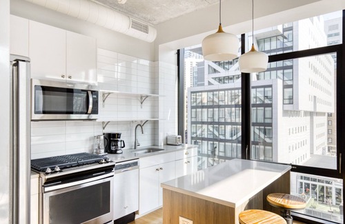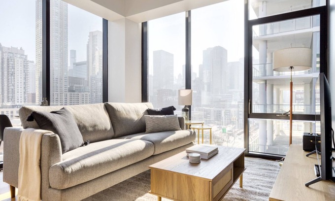 This furnished apartment is located in River North, Chicago’s most trendy neighborhood. The bridges combined with the river walk offer incredible views. Nearby on Michigan Avenue is the city’s premier shopping area. One of the neighborhood’s biggest assets is the walk-to-work appeal. Young professionals, who live and work in the area, can quickly get to the office in the morning and just as easily enjoy an after-work drink, as the area is considered a premier entertainment center. Don’t miss a stroll on Kinzie and Hubbard streets. Merchandise Mart, the iconic building with showrooms, shops, and office space, is only a 5 minute walk. The Loop is just across the bridge and is about 5 minute walk.