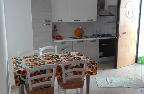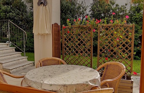 Four-room apartment on the ground floor consisting of living room with kitchen, bathroom with shower, two bedrooms, one double and one with foldaway single beds. Large outdoor veranda equipped with umbrella, table and chairs. Shared garden. Totally furnished and equipped with all comforts.