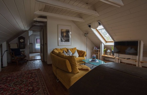 The apartment is located on the upper floor of our detached house and has its own entrance. Access to the garden, or