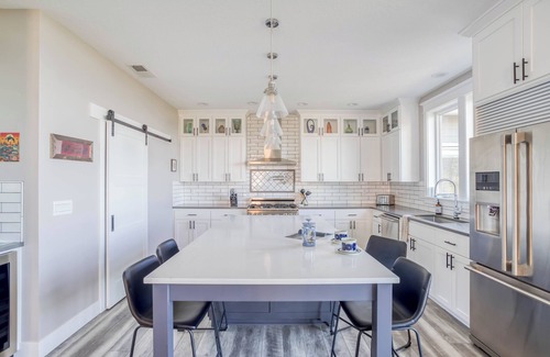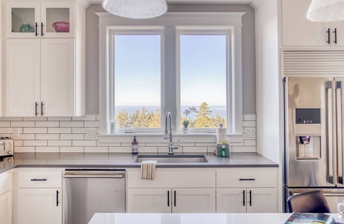 Located on a Depoe Bay ridge overlooking the Pacific, Whale Watch Crow’s Nest is an exquisite single-level home with beautiful finishes, a smart layout, and attractive outdoor spaces, including an outdoor gas fireplace on the enclosed front patio. Minutes by car to Depoe Bay and nearby beaches and coves, this home puts you in easy reach of places to see whales, seals, and seabirds from land or by tour boat. A refined ocean-view living room with a coved ceiling and large picture windows has plush seating perfect for relaxation, a gas fireplace, and a TV. A formal dining space with a sparkling modern chandelier lets you dine and watch the ocean over the treetops. Cooking in the beautifully lit gourmet kitchen is a pleasure—sleek surfaces, stainless steel appliances (including a wine chiller), an ocean view sink, and a copious island give you equipment and space to prepare a feast. A barbecue on the deck lets you grill while you enjoy the sunset.