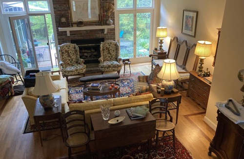 Enter the front door with leaded glass transom into the hardwood foyer. Ahead you will see the over-sized great room with brick fireplace, flanked by glass doors to the rear yard. Ten guests can gather comfortably around the wood burning fireplace (wood provided.) The soaring ceiling can be viewed from the second story bridge above.
