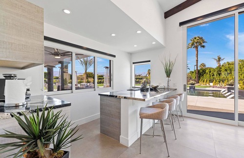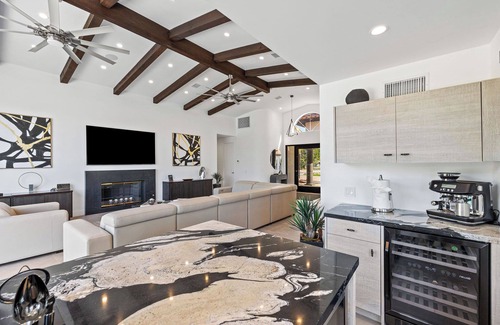 The open concept floorplan has over 4200 square feet to kick back and relax with your group. The great room has comfortable seating and looks out to the pool yard. The gourmet kitchen features high end appliances, gas range, double ovens, and ample counter space. Indoor dining seating for 28 - at the oversized island with 6 seats, second island for 6, kitchen table for 4, and formal dining room for 8. Fabulous bar with prep island and sink, wine fridge and seating for 4. Media room with seating and a TV.